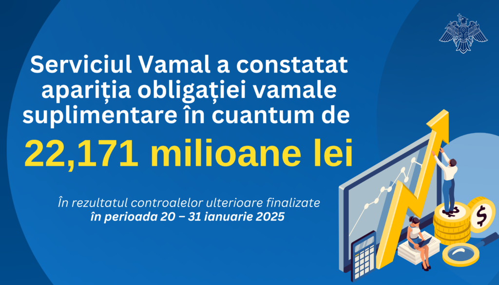 În rezultatul controalelor ulterioare finalizate în perioada 20 – 31 ianuarie 2025, Serviciul Vamal a constatat apariția obligației vamale suplimentare în cuantum de 22,171 milioane lei. Au